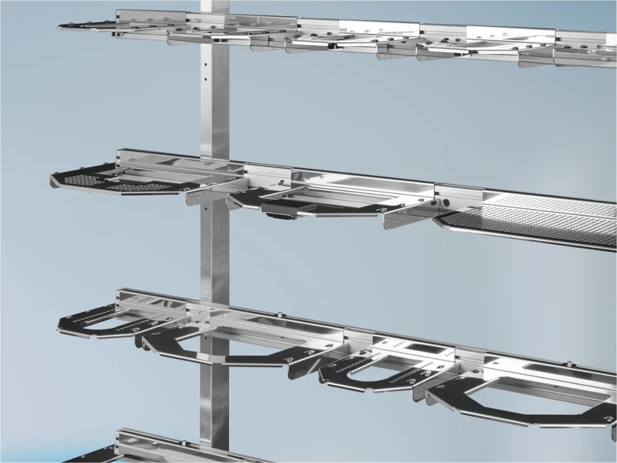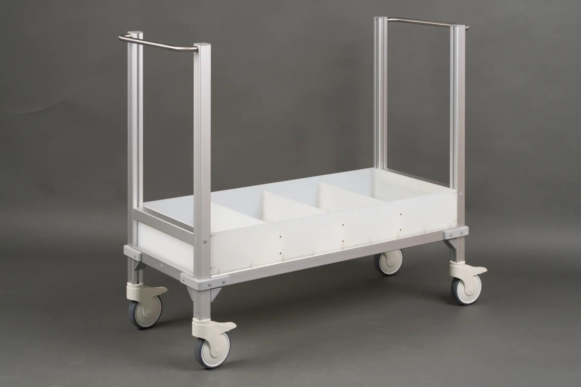 Die Konstruktion wird an Bauteilgröße, Gewicht und Einsatzbereich angepasst und gewährleistet einen sicheren, ergonomischen und reinraumtauglichen Transp
