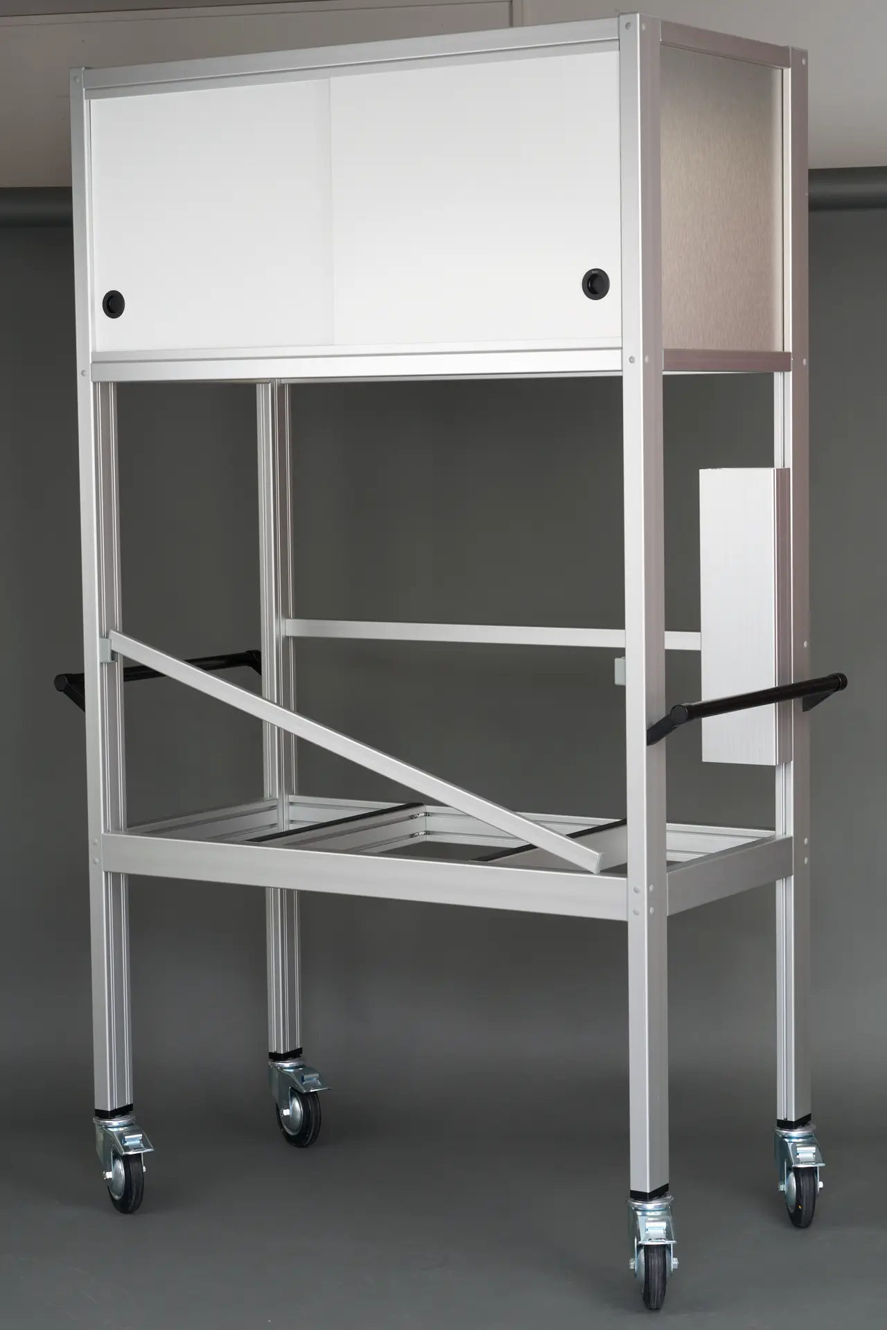 Der Pumpenregalwagen ist für den sicheren Transport schwerer Komponenten wie Pumpen im Reinraum konzipiert.