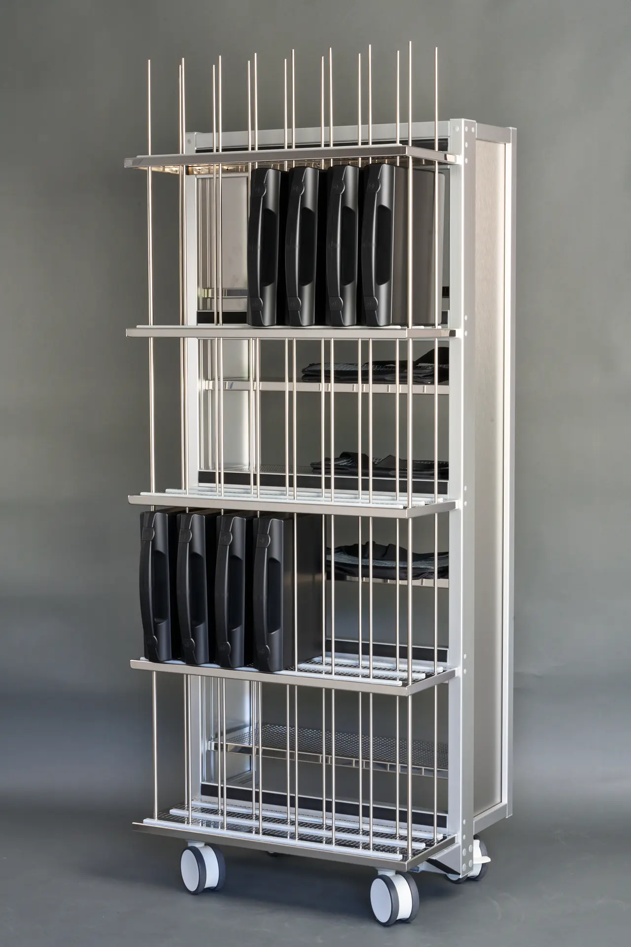 Kofferstationen ermöglichen die strukturierte Ablage und Bereitstellung von Transport- oder Prozesskoffern. Die Planung erfolgt angepasst an Kofferformate, Zugriffsanforderungen und vorhandene Flächen und unterstützt eine übersichtliche und geordnete Arbeitsumgebung.
