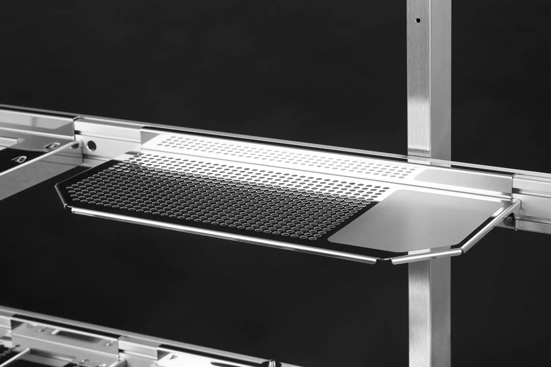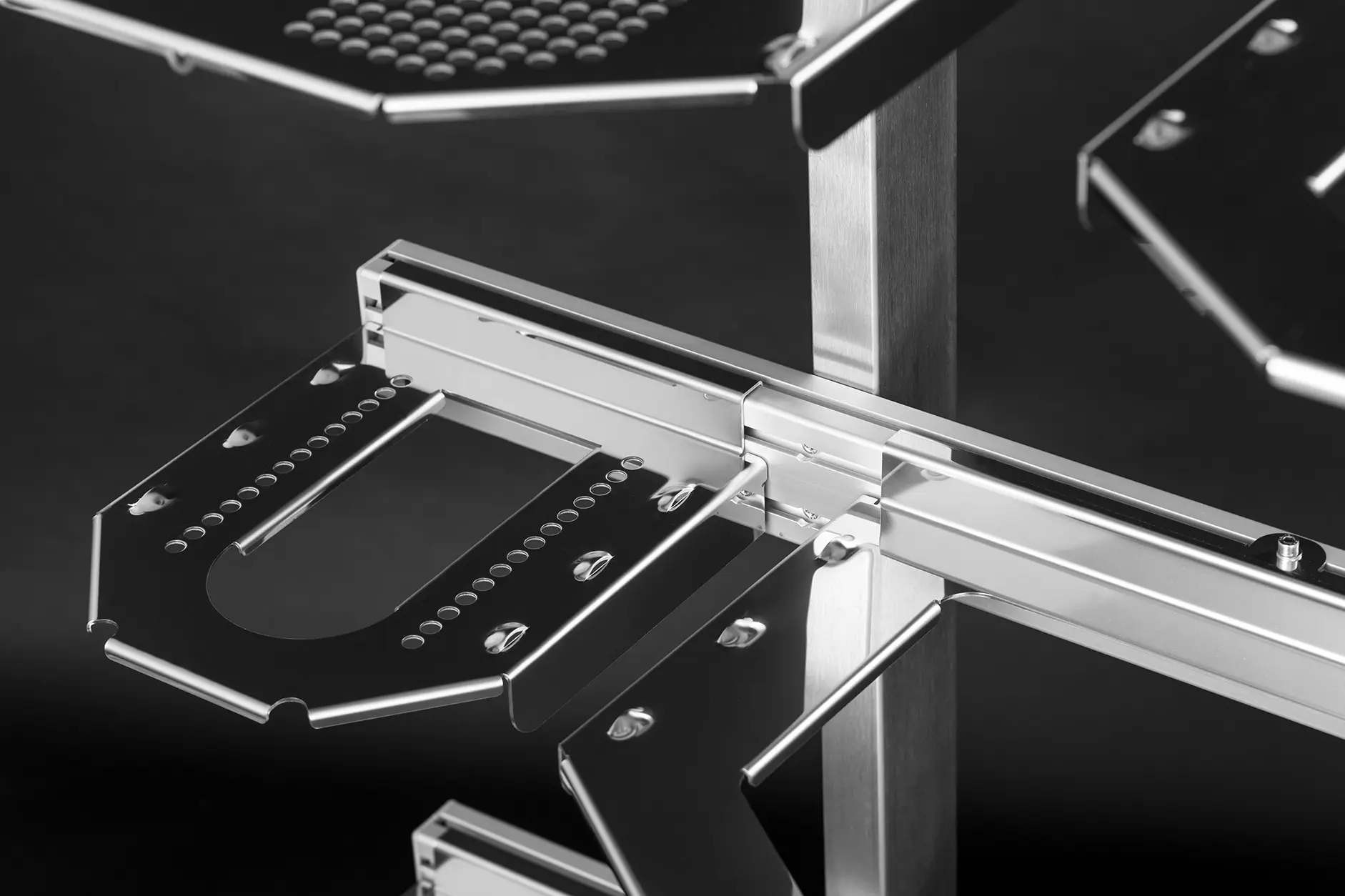 Die aus spiegelblankem Edelstahl gefertigten Aufnahmeschalen werden mittels Sicherungsschraube fest mit dem Rack verbunden.